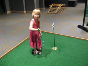 Leslie enjoyed the golf. She and Stephen and Mitchell also loved the play room. They had a toy cash register and small groceries. They played there a long time.