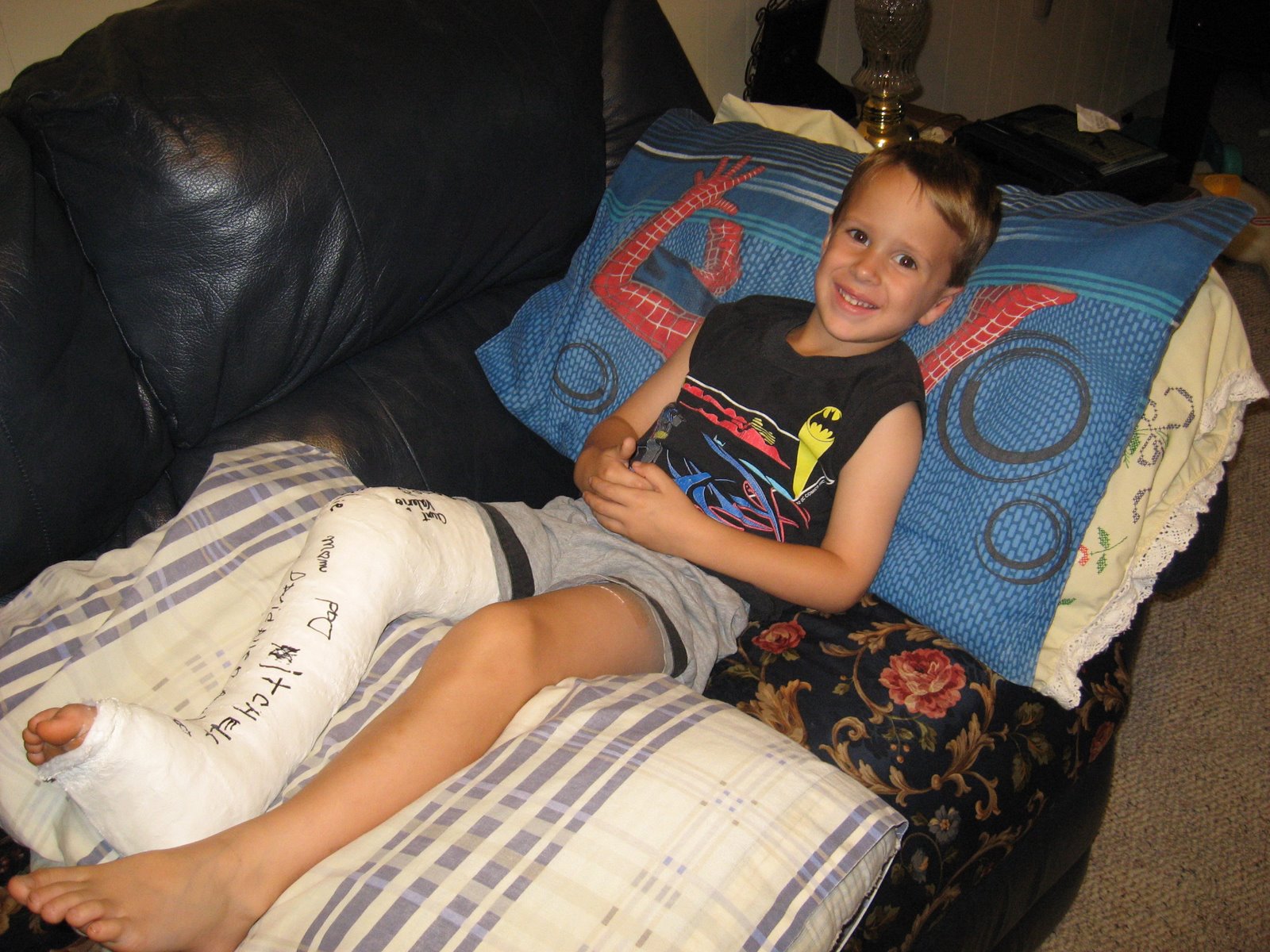 On July 26, Melanie and I had made plans to go to Olive Garden with two of her friends. I’d already heard many nice things about Angie and Wendy, but it was so nice to put a face with the name. Right as the server was bringing our salad, Mel’s cell phone rang. It was her husband, Walter. He called to tell us that Stephen broke his leg while jumping on the trampoline, and it looked bad. We didn’t know what to do. Leave right then and go to the hospital, or stay and eat and then go?? Well, we finished our meal, but it was definitely a meal shrouded in fear. At one point, Walter called to say the doctors had said Stephen might need surgery. We praise the Lord that he didn’t. He got a cast, and some heavy pain medication and was able to go home.