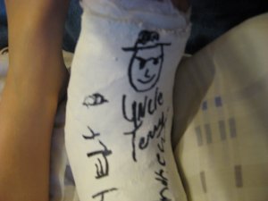 Here’s Terry’s “artwork” on Stephen’s cast. I thought it was so cute. But, I am a little biased. :]