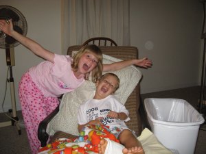 All of my kids are just like their Dad! I can’t get over it, they are just carbon copies! Here’s Lauren with her injured cousin, Stephen.