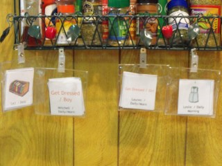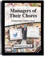 Recently, a good friend commented and asked to hear more about the Chore Packs system that I wrote about in a previous post. This system was created by Mrs. Terri Maxwell, a homeschooling mom of eight. She has written a book called Managers of Their Chores in which she explains the importance of chores and how to use the Chore Packs system. Included with the book are four “chore packs” (see photo below), a sleeve to hold extra chore cards, and card stock to print or write the chores on. I also purchased the software, called “Chore Ware” to set up my chore packs system. The best part of the software is being able to print out picture cards for my pre-readers! I’m not an artist!