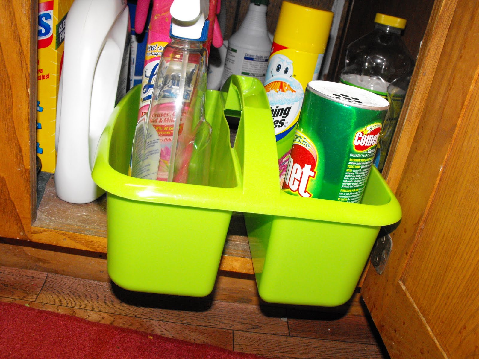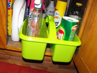 Another item that has come in very handy for chore use, is this plastic carrying container, pictured below. It has a handle and easily holds all of the cleaning supplies for cleaning the bathroom. I have made my oldest daughter a chore card for each job related to cleaning the bathroom. I have one that says  “Clean sink and counter”, “Clean toilet”, “Clean mirror” and so forth, so she doesn’t forget any part of the job. I then showed her how to do each job correctly. I placed the cleaning items in this container so she can locate the cleaning supplies easily, keep up with them while cleaning, and return them to their proper place with ease. I love it! Ironically, I purchased this container in the teacher section of a Christian bookstore!