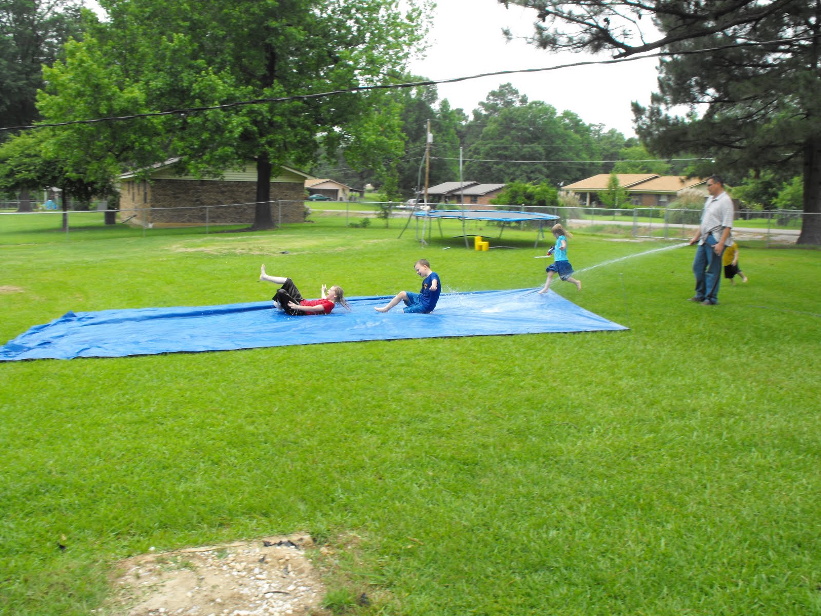 It has been very hot and humid here, in fact, our home thermometer has read 100 degrees once already! Yesterday, the kids eagerly requested that Terry “puh-leeeeeze” spray them with the water hose to cool them off. He agreed to do so today. However, it turns out that he came up with an even better idea, one which thrilled the kids even more! He created a homemade “slip ‘n’ slide” using an old tarp and a water hose! Our kids were laughing and squealing with such delight that the neighbors wanted to come join us. 🙂