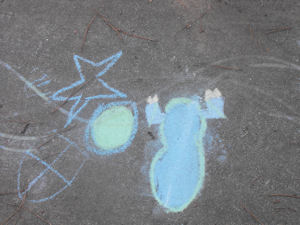 The kids are enjoying the warmer, yes, even hotter, temps that we’ve had. We had a pretty cold and wet winter (for us), so being able to be outside without a coat, even if you’re dripping with sweat, has been a nice change. Lauren has enjoyed making chalk drawings outside.ย