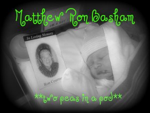 An online friend of mine made this with a photo I took of Matthew. His middle name is after my Dad, Ron Courtney. Our oldest son’s middle name is after his paternal Grandfather, and we are blessed to be able to pass on the maternal Grandfather’s name as well. Dad went to Heaven six years ago, and I don’t know if he can see his namesake now or not, but I hope to pass on the heritage that my Dad left me, and that would be one of walking with God. I pray Matthew accepts the Lord, just like Dad, and gives his life to living for Him, just like Dad. It would be wonderful to be able to introduce them to one another on those glorious streets of gold!