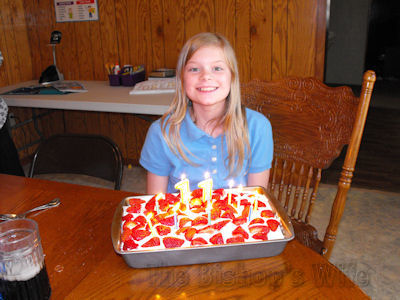 She chose chocolate cake, with Cool Whip frosting and strawberries all over it. She loved having all those candles, too! 🙂