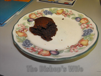 In a mixing bowl, combine the eggs, butter, oil, sugar and vanilla. Mix well. Add the rest of the ingredients, and mix well until blended. **Valerie’s note: The batter will be extremely thick. You will think you are mixing concrete, but you are not. Also, if you leave a few little bits of unmixed cocoa powder (like I did) it should be okay. After all, my arm just couldn’t stir forever. Plus, I didn’t want to over mix it. End of note.** Thank you. 🙂