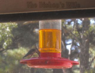 In this one, there is a hummingbird fluttering to the right of the feeder.
