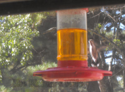 My husband has been so kind to mix up hummingbird food for me and keep the feeder above my kitchen window filled. I have really enjoyed watching the birds come in for food. I saw five fluttering around it at once just last week! I’ve been trying to capture them around the feeder, but they are so fast, it’s hard to do so. About two weeks ago, I finally snapped a few photos of the birds. I hope you can see them, I’m sorry I’m not a better photographer!