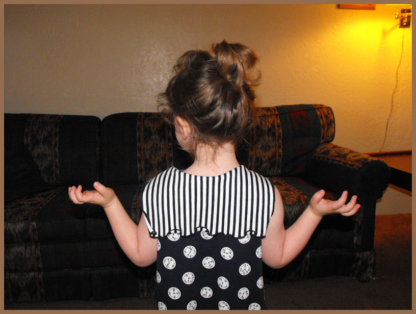 Yesterday, I noticed that her hair is long enough for her to pull it down and twirl it with her left hand. I also noticed that she had gotten syrup in it from breakfast! We washed that out and then, after it dried, we decided we could put it up in a pony-tail…well, it would be more like a “pig-tail”, to keep it out of her way as she goes about wreaking joy and havoc. 😉 We couldn’t find any scrunchies, so I improvised with a jaw clip. I couldn’t believe it stayed in her hair! She looked all dressed up.