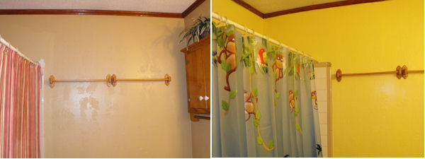 One thing my hubby and I tackled while I was away from blog-world, was our hallway bathroom. This is the bathroom our guests use, as well as our kids. I wanted to brighten it up a bit, so I chose a light yellow, semi-gloss paint. We also got a new shower curtain, that was more kid-like. Here are some  before and after photos! (Click to enlarge.)
