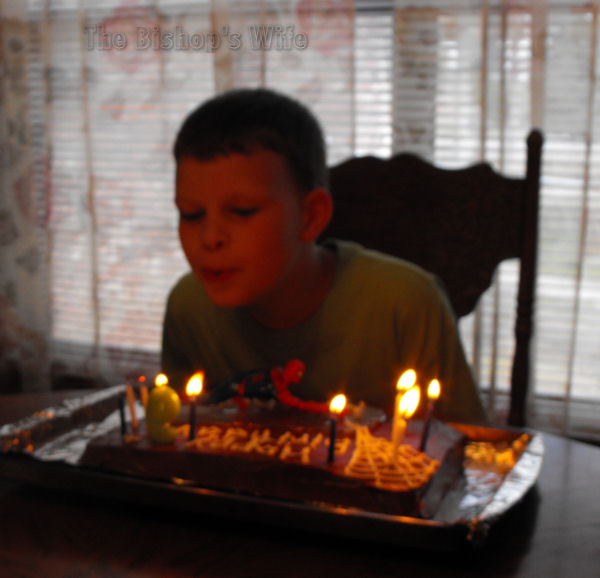 He couldnt’ decide on a what he wanted for his birthday, so we gave him money to spend when he decided. He got several birthday cards from family, and they graciously gave him more money! He should be able to pick out something nice. If can ever decide what. πŸ™‚ He asked for a Spiderman cake. Those are kind of expensive at the bakery, so I just baked his favorite – chocolate on chocolate -and purchased the Spiderman kit that the bakery puts on the cake they would make. He was pleased, and so was I. I saved about $15!