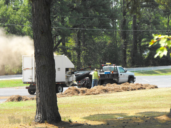 The dust in the picture is caused from the truck's chewing up the pine needles. They just turn it all to mulch. I'm not sure where they dump it, though.