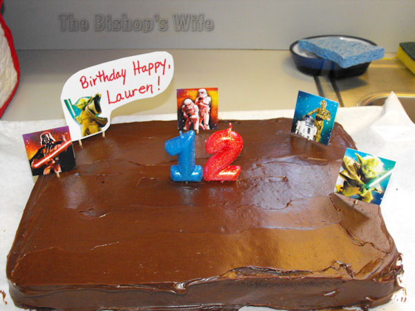 Lauren loves Star Wars and chocolate! I made her a chocolate cake. I bought Star Wars stickers and placed them on card stock and cut them out. I taped toothpicks to the back and placed them on the cake. The sign that Yoda is holding says “Birthday Happy, Lauren.” (Notice I mixed up the order of the words, trying to be “Yoda-like”. Lauren got a kick out of it. 😉