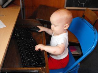 Matthew enjoyed “typing” when the little girls set him at the desk back in July.
