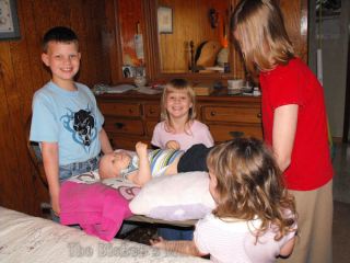 They used Matthew as a patient – they laid him on a homemade stretcher and carried him around the house. He’s such a good sport. 😉