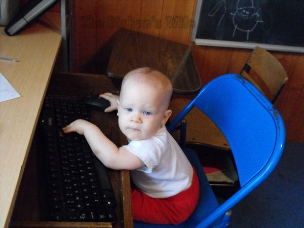 Matthew enjoyed “typing” when the little girls set him at the desk back in July.