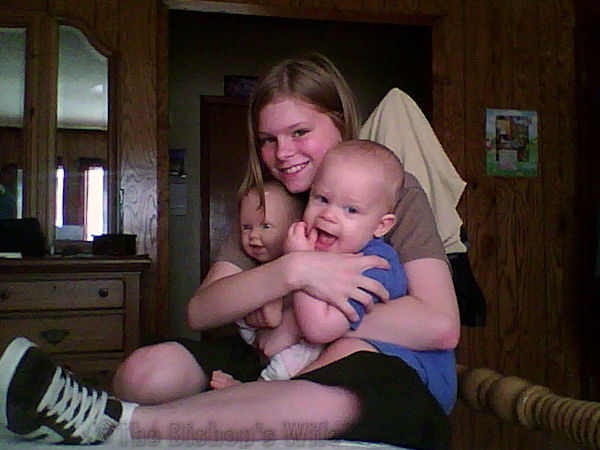This is my most recent photo. Lauren is so good to her baby brother. Here she is cuddling with him. Oh, and allow me to introduce you to his wife. The lovely doll beside him (really, it’s a doll) is his wife. At least, that’s what the little girls told me. 😉