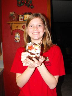 Here’s the finished product: Striped Pudding Parfait! It is chocolate pudding, Cool Whip, strawberries and bananas. It was very tasty! 🙂