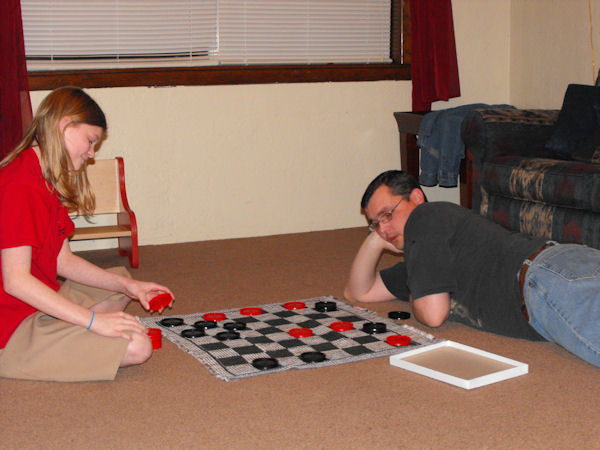 A game of checkers. Matthew was lying on his stomach watching them, but I missed the photo op!