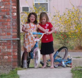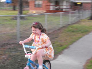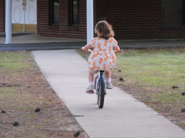 Well, on March 6, 2012, another bittersweet moment went into the annuls of Basham family history. *sniff sniff* My youngest girl has taken of on two wheels! (I’m really dreading the day when it’s FOUR wheels!) It was so sweet to watch her face as she took off. She didn’t fall even once, because her training wheels had become so “pushed up” that they were rarely, if ever, touching the ground! She was already doing it on her own, but didn’t realize it! She is riding an old bike of Leslie’s that has been refurbished, Basham style! In other words, the back tire was damaged so it was replaced with the back tire from Mitchell’s old bike. He’d outgrown it, but we saved it for parts. Good thing, too, because it came in handy! That is why she has one white tire and one black. (We prefer frugal over fashionable! heehee!)