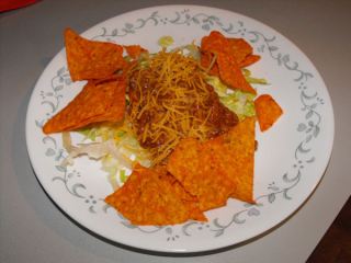 Make a nice bed of lettuces and pour meat mixture on top. Top with cheese, tomatoes, etc. Place Doritos chips around salad, or crumble on top.