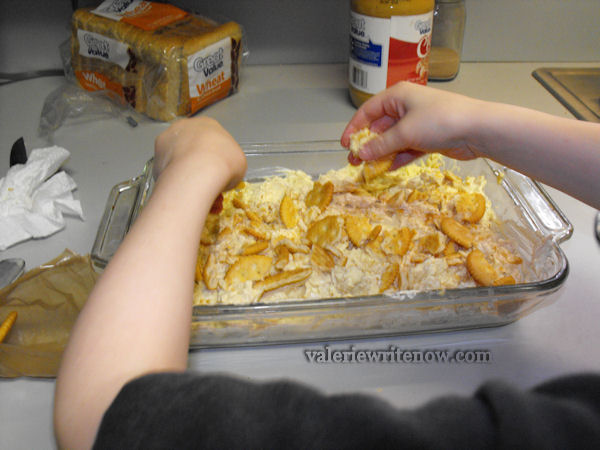 After Mitchell made his soup, it was Leslie’s turn to pick something to make with mom. She chose a recipe from the family favorite list, Ritz chicken! Here are some photos of her at work: