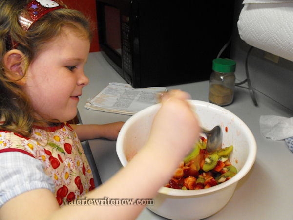 - Meanwhile, prepare fruit topping by washing strawberries with cool water. Remove stems and slice. Peel and slice kiwis and add to strawberries.