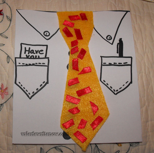 Lauren drew this dress shirt for her dad. This is so precious to me. It epitomizes her dad completely. One look at this and we see that he is a soul winner (see tract in pocket on your left), that he is studious (see pen on right), and that he wears a tie, which in our case, means he is a preacher. The tie is made from a piece of felt, with a ribbon cut up and glued on for the pattern.