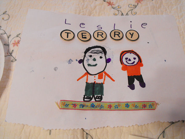 Leslie found these wooden letters. She needed an “E” and a “Y”. She used an “F” and drew in the line to make an “E”. She used “l” to make a “Y”! 🙂 This is a picture of her with her dad.