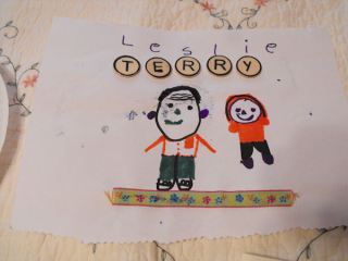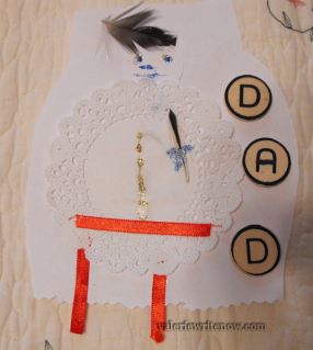 Mitchell made his dad out of a paper doily! 🙂 He also used the wooden letters, and needed an “A”, so he drew a line across a “U”! 🙂 He cut a feather to make his hair and the pen (on right, like it’s in a pocket), which Dad always carries!