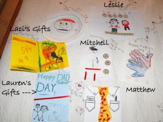I’m never very good at planning ahead for seasonal crafts. This is an area in which I’m trying to improve. Because of this, I don’t have any one cute thing that we did for Terry. We bought him a couple of movies that he likes and then I got out the craft box (or maybe Lauren got it out?) and they dug in and made whatever they wanted for their dad. Here’s what they came up with: {click to enlarge}