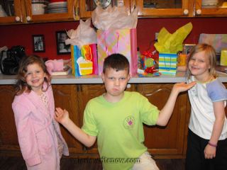Laci, Mitch and Leslie with her gifts. I do not understand Mitchell’s expression here. And please don’t ask me why Laci is wearing her bathrobe over her clothes. I’m only her mother.