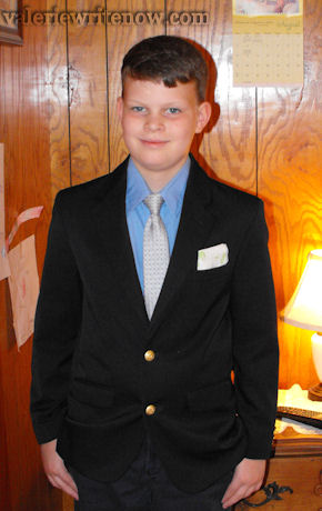 This morning, Mitchell got ready for church, picking out a suit coat, dress shirt and tie all on his own. He always wears a button-up dress shirt on Sundays, but we don’t require a tie and coat every week. I noticed after he was dressed and ready to go, that he’d put a paper napkin (it even has a green flower design on it), in his coat in place of a handkerchief! It was too precious a moment to pass up – I had to photograph it. I hope you can see the napkin clearly enough in the photos below. My camera doesn’t capture the detail that I wish it did.