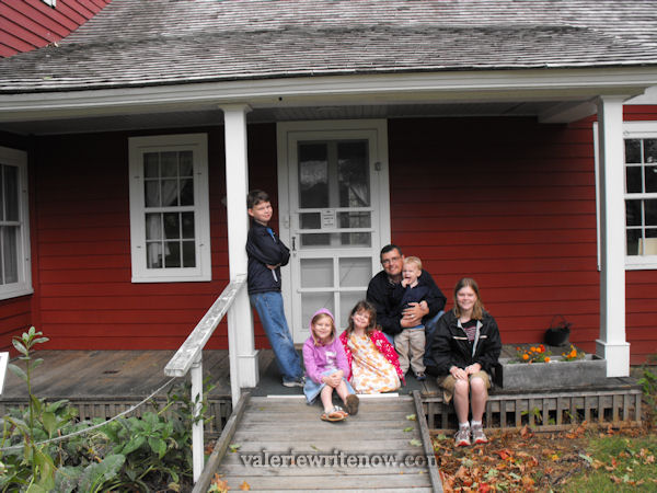Here’s our family on the front porch. Behind this door is the kitchen. To the right is an entry/storage room. It had a cot for the teacher to sleep on when it was the Wilder’s turn to board him. To the left is the dining room and then Mother and Father’s room, which was very small!
