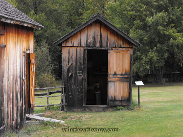 The pump house, where the pump was hard to work! The little rail of wood to the left, between the fence rails, is the tiny trough that fed the water from the pump to the large trough for the animals. It leaked, by the way. Poor Almanzo!Β