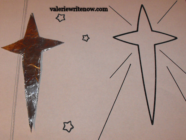 I needed a star of Bethlehem for my nativity scene on my Sunday School bulletin board. I was going to just color one from a coloring book, but then, inspiration struck! I quickly grabbed my journal, to bronze the moment. Okay, not really, but I am bronzing it here. Inspiration doesn’t strike me very often! Perhaps this idea will help other Sunday school teachers out there.