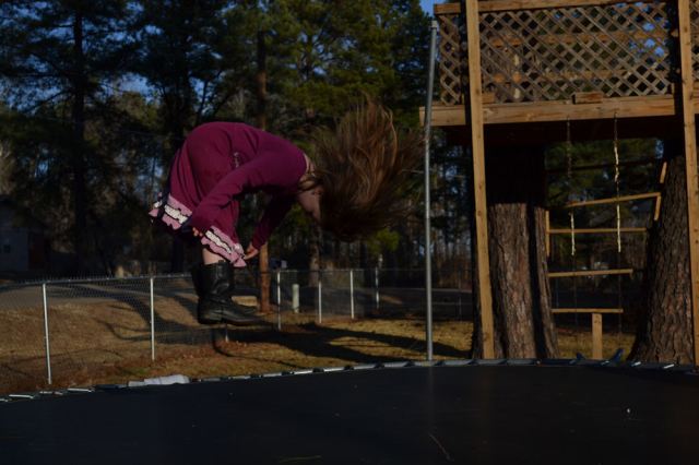 I know these photos are not great. I need to figure out the right level of exposure. I just noticed that I can adjust the white balance to various settings – cloudy, shade, incandescent, etc – I can’t wait to try this feature. I have been enjoying the ability to take continuous photos – hold down the shutter and it snaps one picture right after the next. This is a great feature for capturing motion. I took these pictures using the shutter priority mode on my camera, which has been much trickier for me to figure out than the aperture priority mode. All that to say, I was extremely enthusiastic about these results! The kids were willing to jump on the trampoline so I could practice, despite the chilly weather. Oh! And I have not altered these photos at all, other than to re-size them for a quicker upload. Thanks for looking at my amateur photography.
