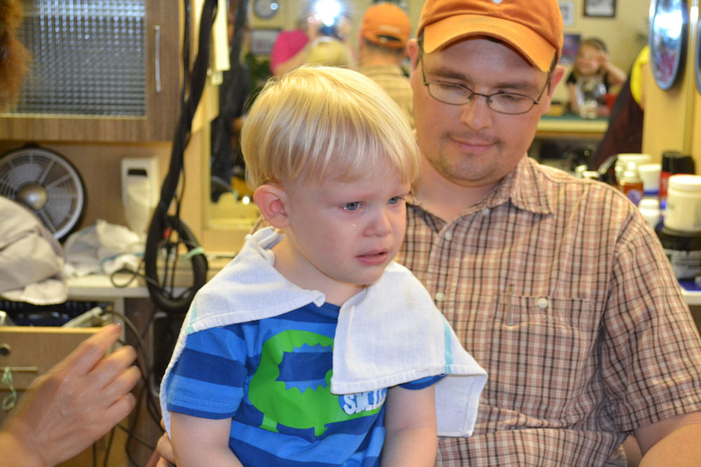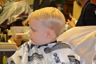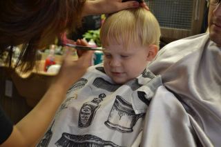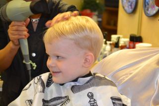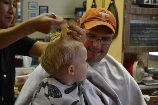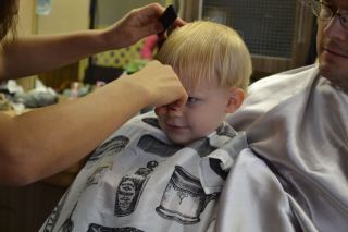 He was a little teary at first, but then Terry got in the chair and held him and he was fine. His barber’s name was In and she was very sweet. She kept saying how cute he was. 🙂