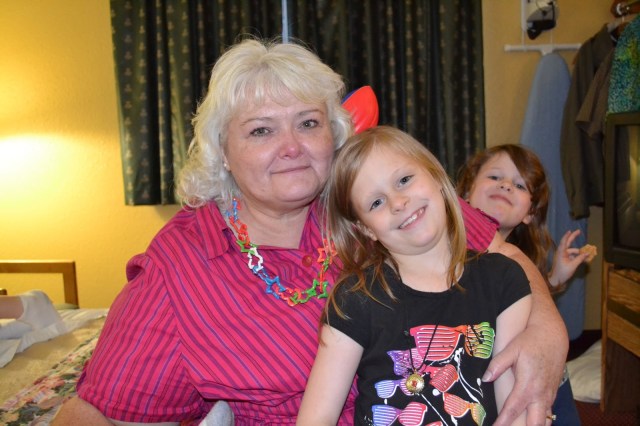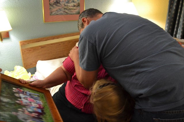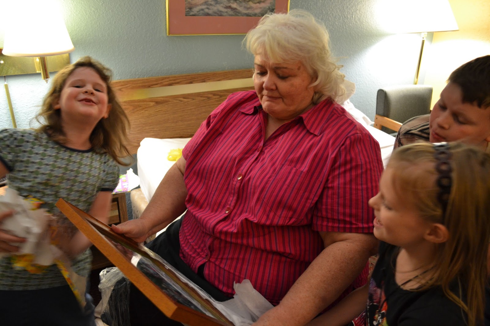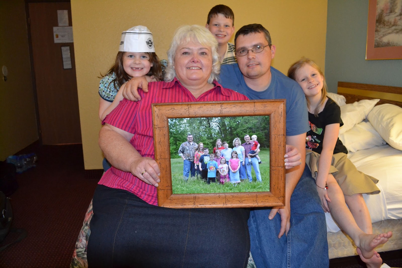 As soon as we met up with Terry’s parents at the hotel, we pulled out the birthday gift we’d hauled with us over two thousand miles. We couldn’t wait to give it to her! In May, when we visited Terry’s brother Joel and his family, we set up the tripod for my Nikon and took a photo of our families together. We had it framed at Hobby Lobby and presented it to her in Kentucky. She loved it. And we loved that she loved it. It’s a great feeling doing something special for someone you love. The Lord blessed and the photo turned out really well, considering we had 8 children to pose! 🙂