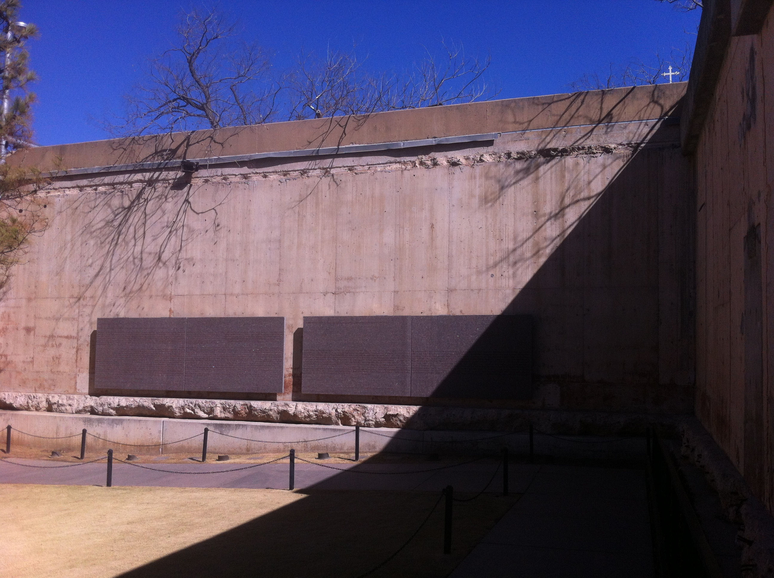 This is the only surviving wall of the Murrah building. On the tablets are listed the names of the survivors.