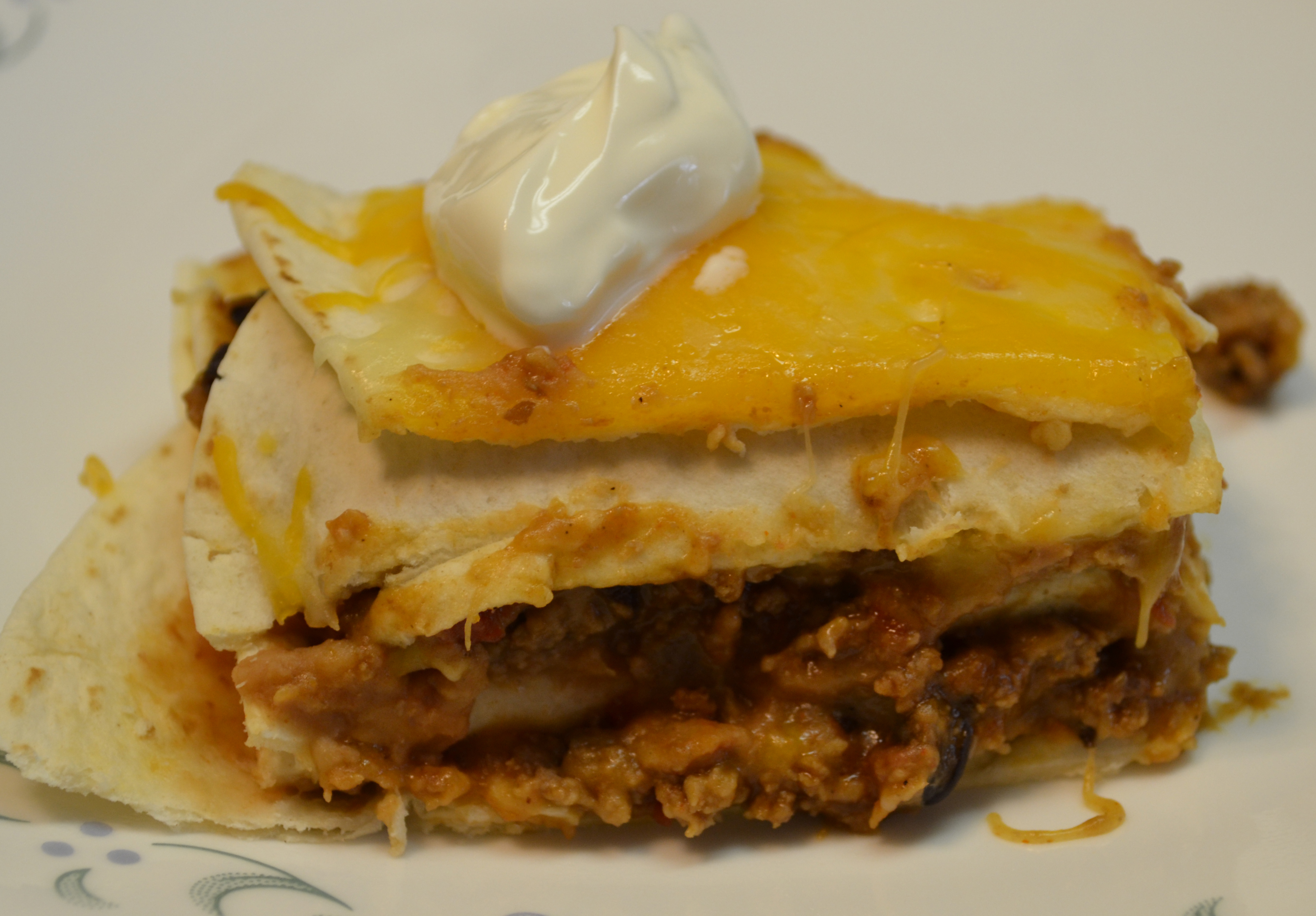 Place two tortillas in a greased 9 x 13 pan. Spread with half of the refried beans, then with half of the beef mixture; sprinkle with 1 cup cheese. Repeat layers. Top with remaining tortillas and cheese. Cover and bake at 350 degrees for 25-30 minutes or until heated through and cheese is melted. Top with sour cream, avocado or anything that floats your boat. ๐