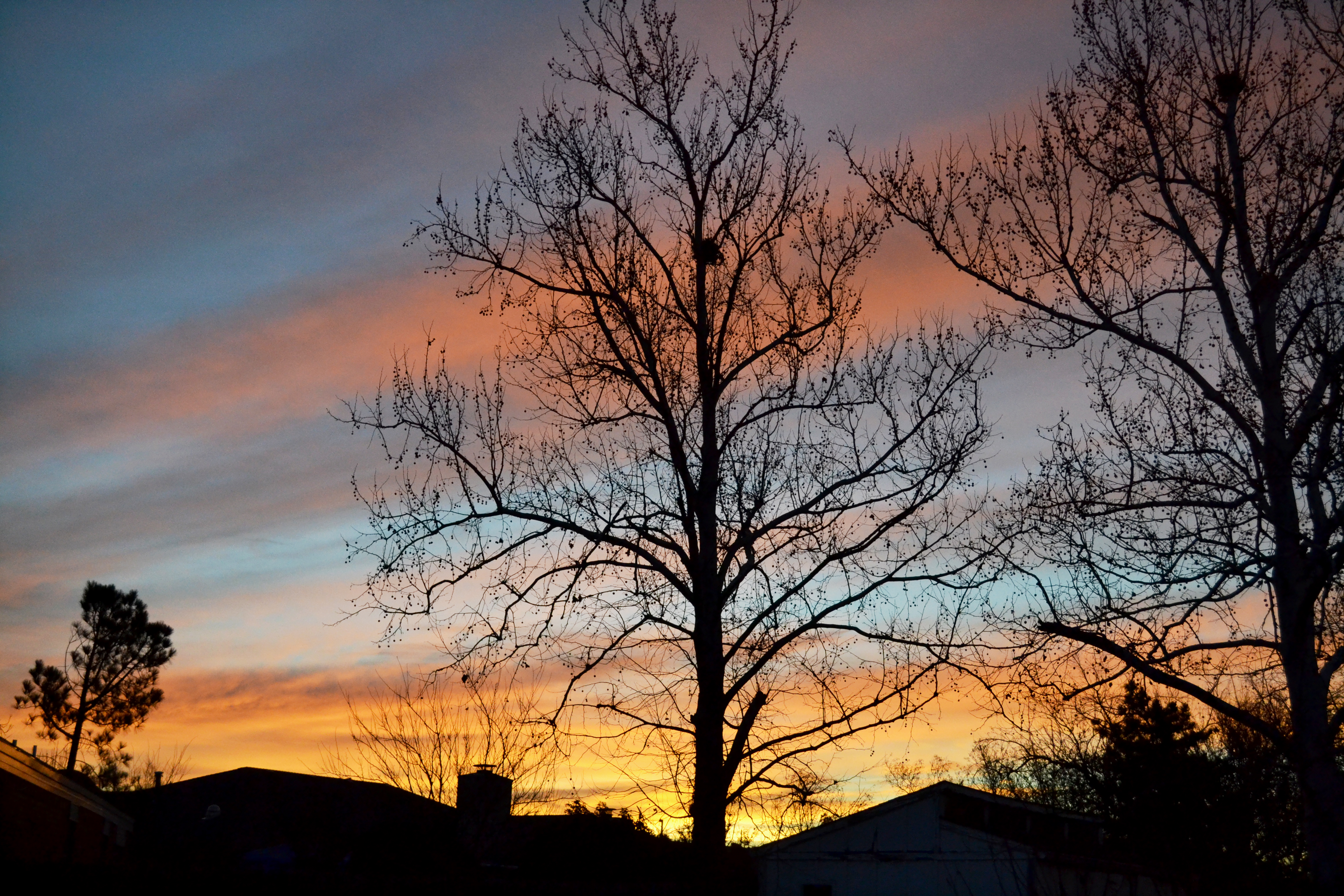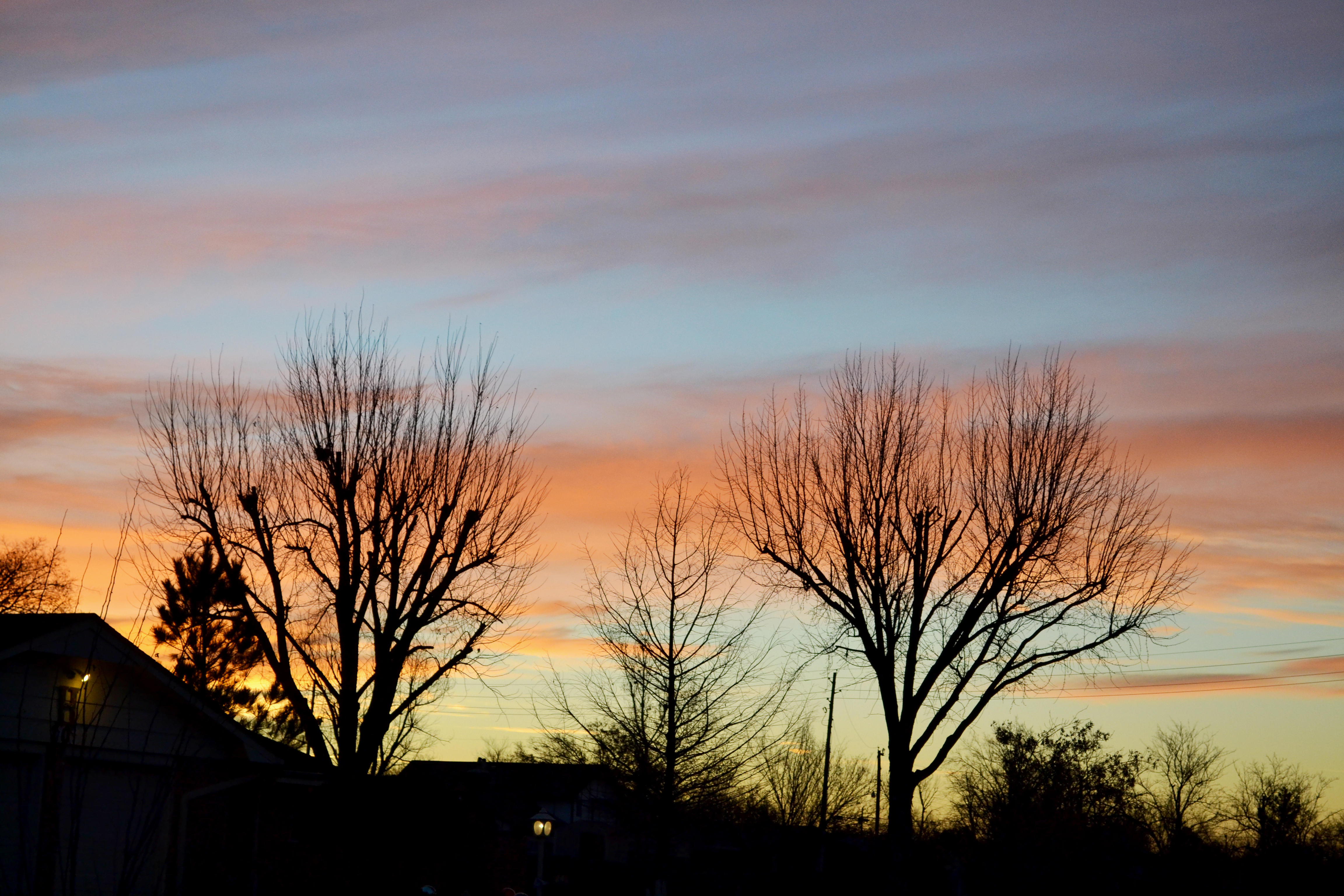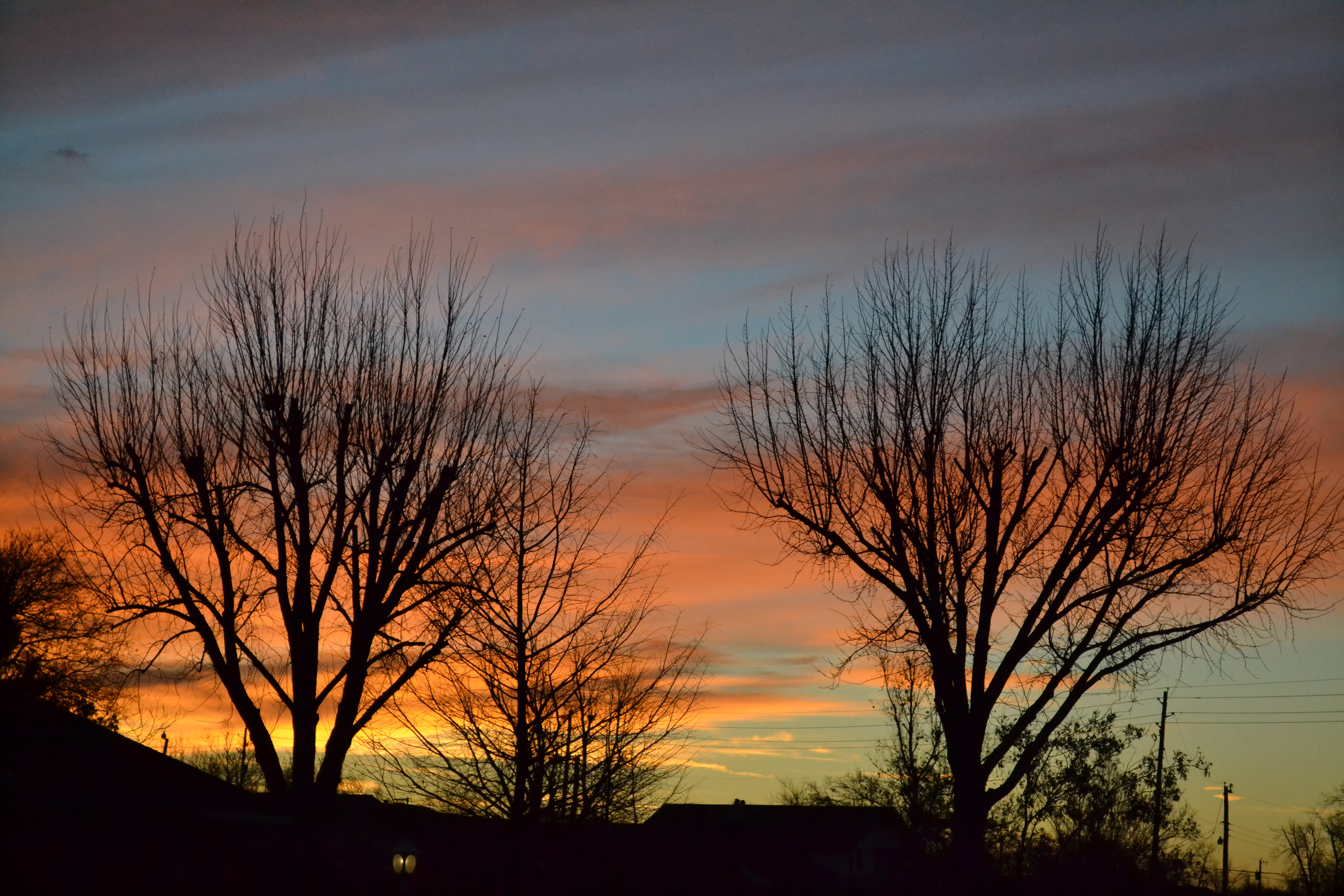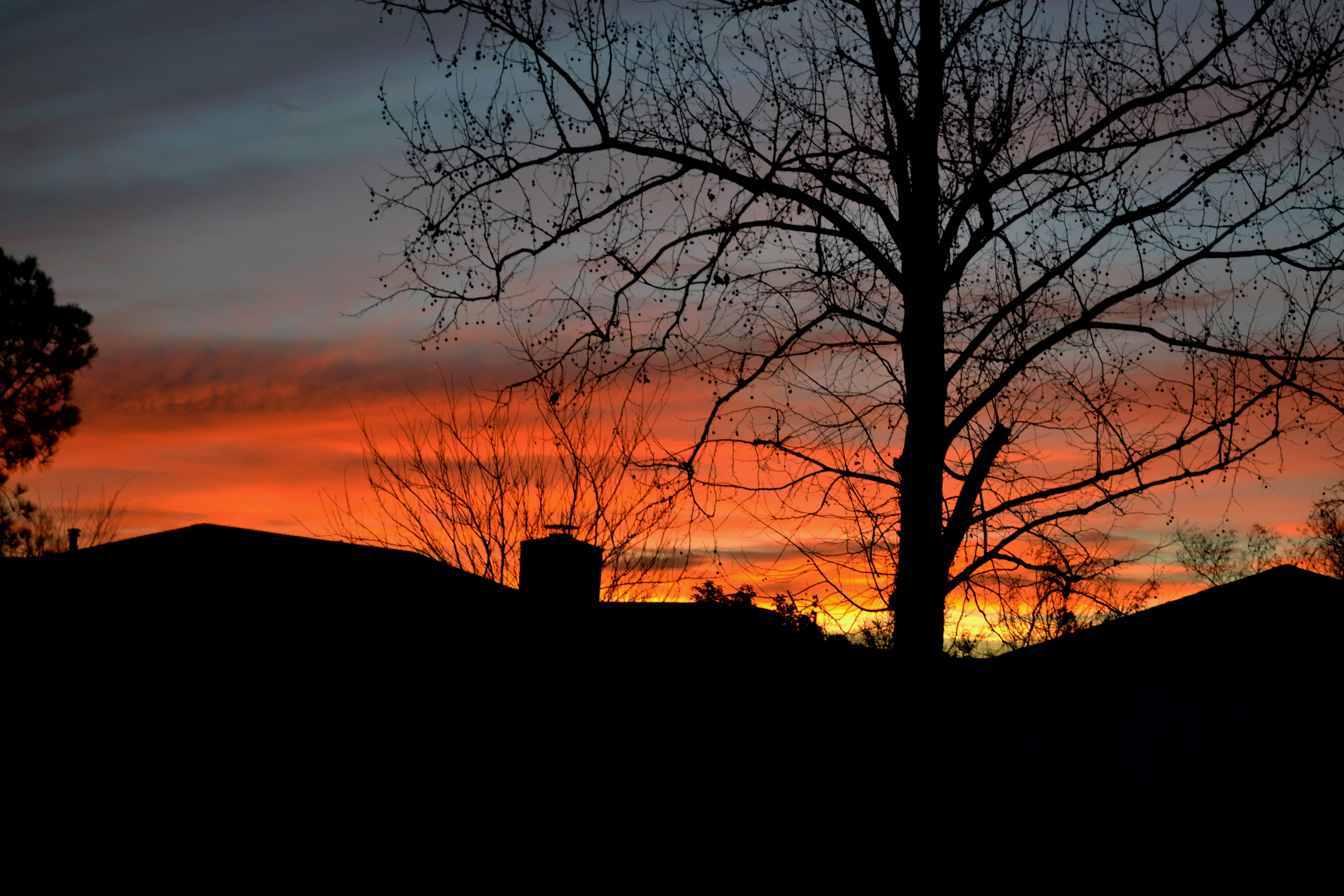 I have seen some gorgeous photos of sunrises and sunsets. The most beautiful ones seem to come from the desert or the mountains. But right here in town, I have seen some lovely sunrises and sunsets. They have been scarce this winter, though. We’ve had weeks of cloudy skies. Those are days when daylight comes, but it seems that dawn skips us. I made it home from my walk this past Monday, January 19, 2015, just in time to see a lovely sunrise. I grabbed my Nikon and tried to snap some photos, but sunrises don’t dawdle, so I didn’t have much time to perfect the shots by changing the settings. I did as many as I could, and tweaked them a bit using Photoshop Elements. Here are my results: