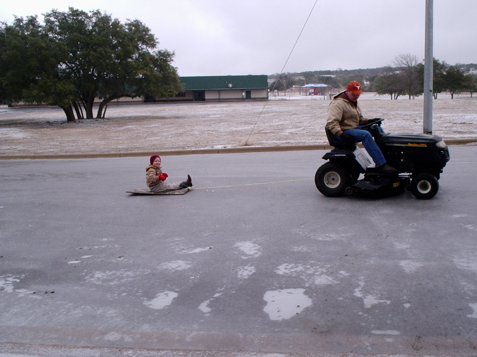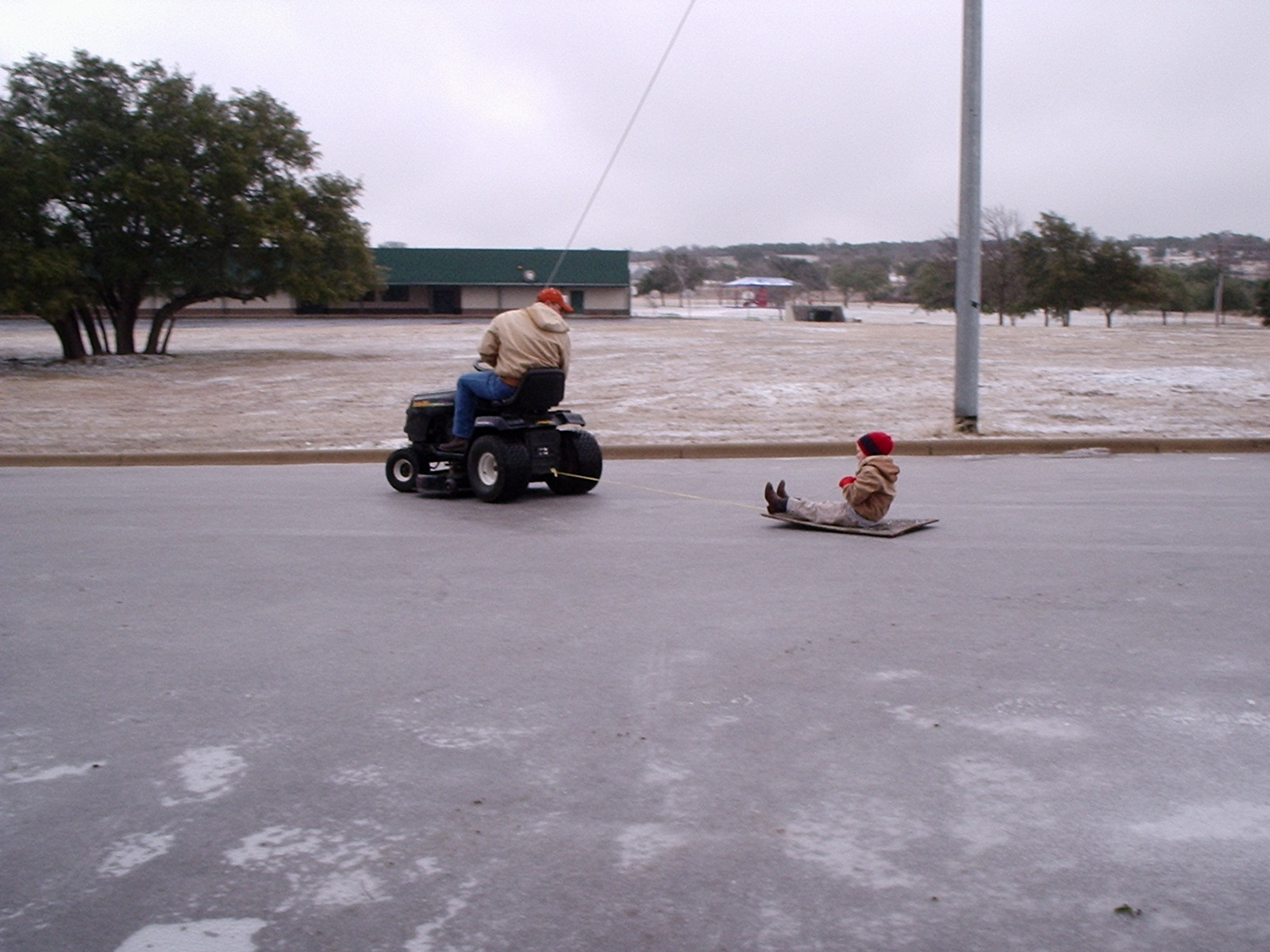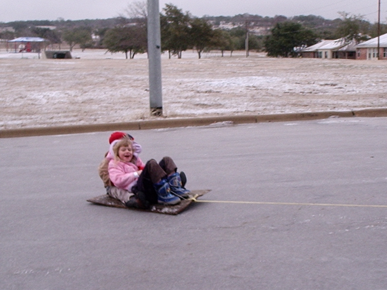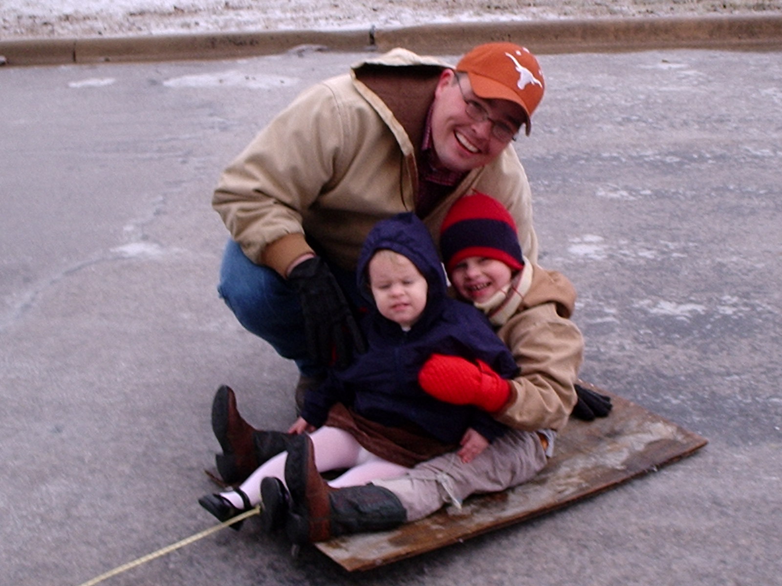 We had a large area to mow when we pastored in Burnet, Texas. When we got an unexpected ice storm, Terry rigged up the church’s riding lawn mower to a homemade sled and took the kids for a ride. I managed to grab my camera and dash outside to take a few snapshots. As I recall, I didn’t even put a coat on, so the pictures were quick. I was caring for four young children, two of whom were in diapers. Snapping photos was low on my list of priorities back then. At least I have a few memories from those busy days which are now mostly a blur.
