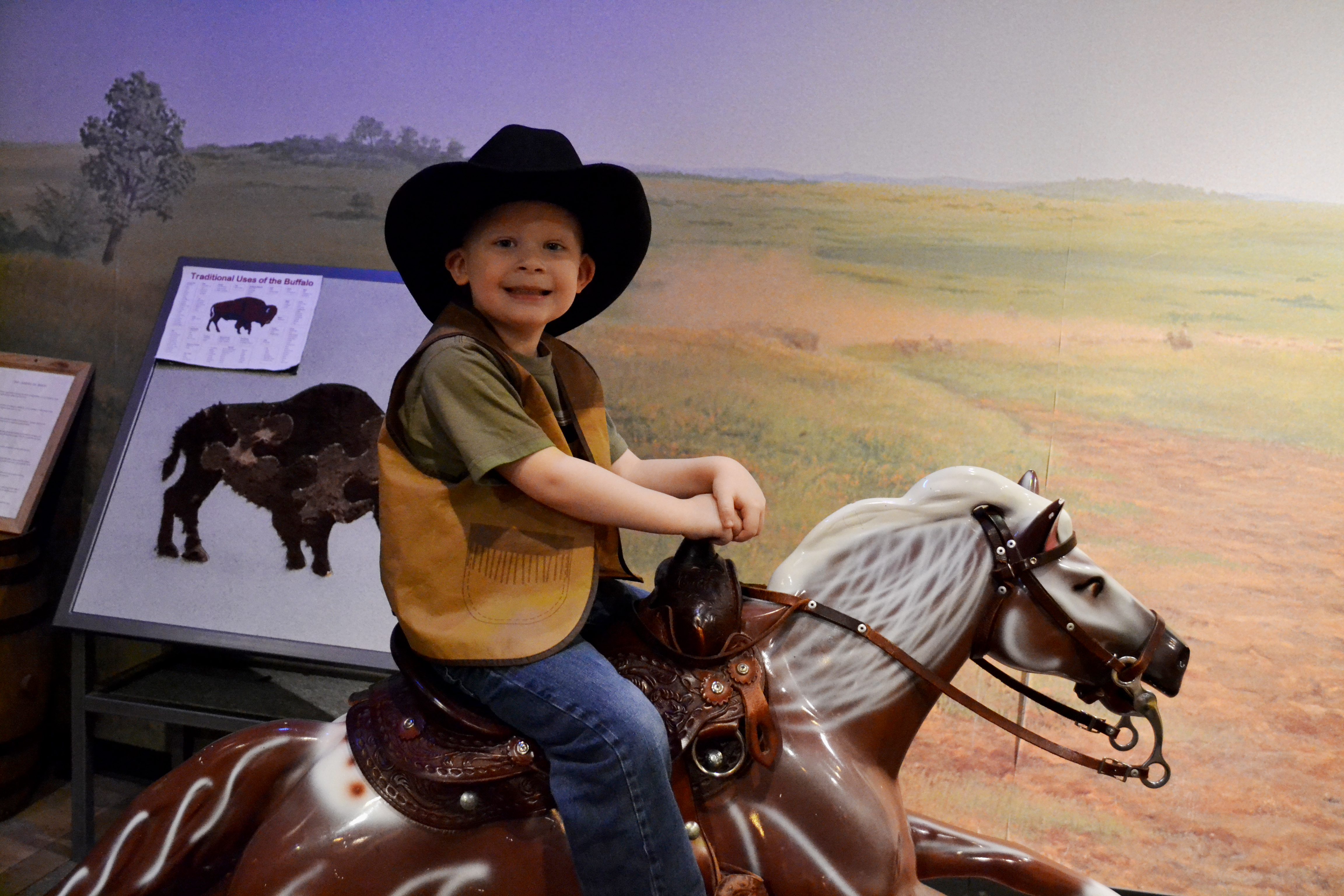 They have a small area where kids can dress up in hats and vests, and practice cattle-roping. They have a mock-up general store and a wagon, loaded and ready for the trail. They also have an animatronics presentation featuring Jesse Chisholm and a cowboy out on the trail. These robots were designed by the folks at Disney, and they are top-notch. They also have a small art museum featuring local artists and their renderings of the wild west. Outside the museum, they have a scale-model of the renowned trail that you can walk, noting the most famous landmarks.