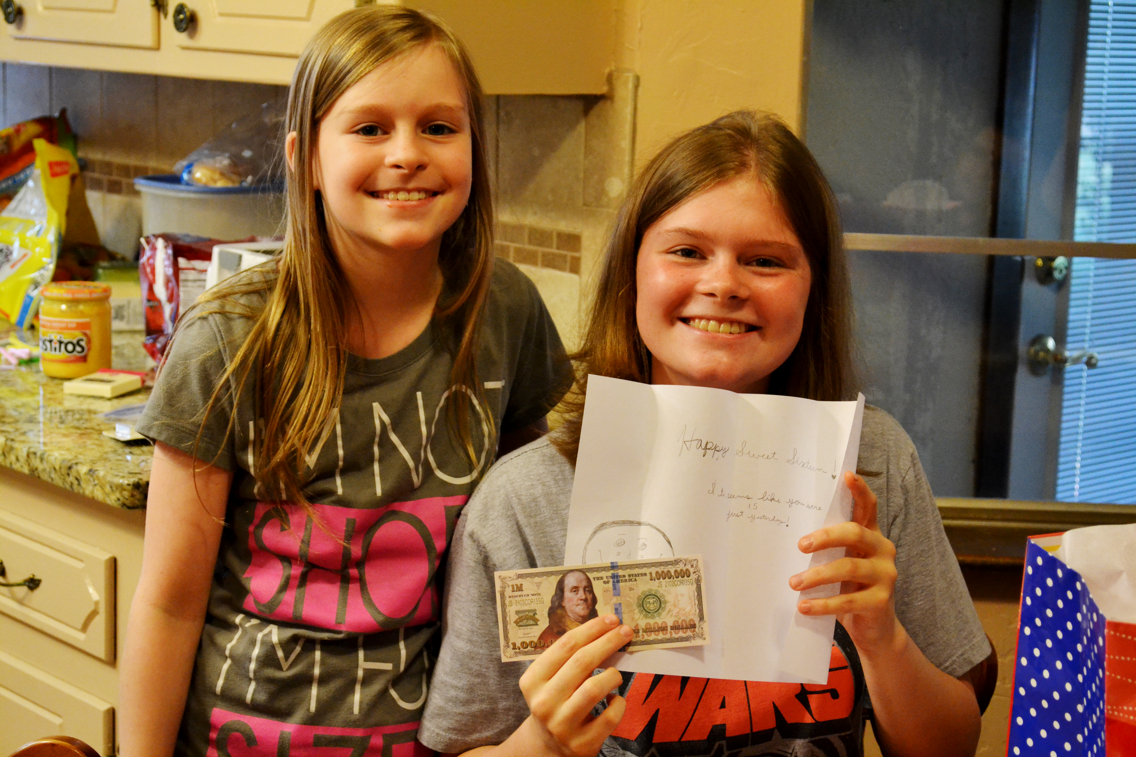 Leslie gave her a note and a tract that looks like money. She said, “You’re worth a million!”