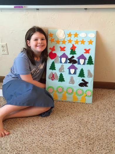 I use these felt pieces to teach patterns and practice counting with Matthew. Laci used them to create a felt masterpiece!
