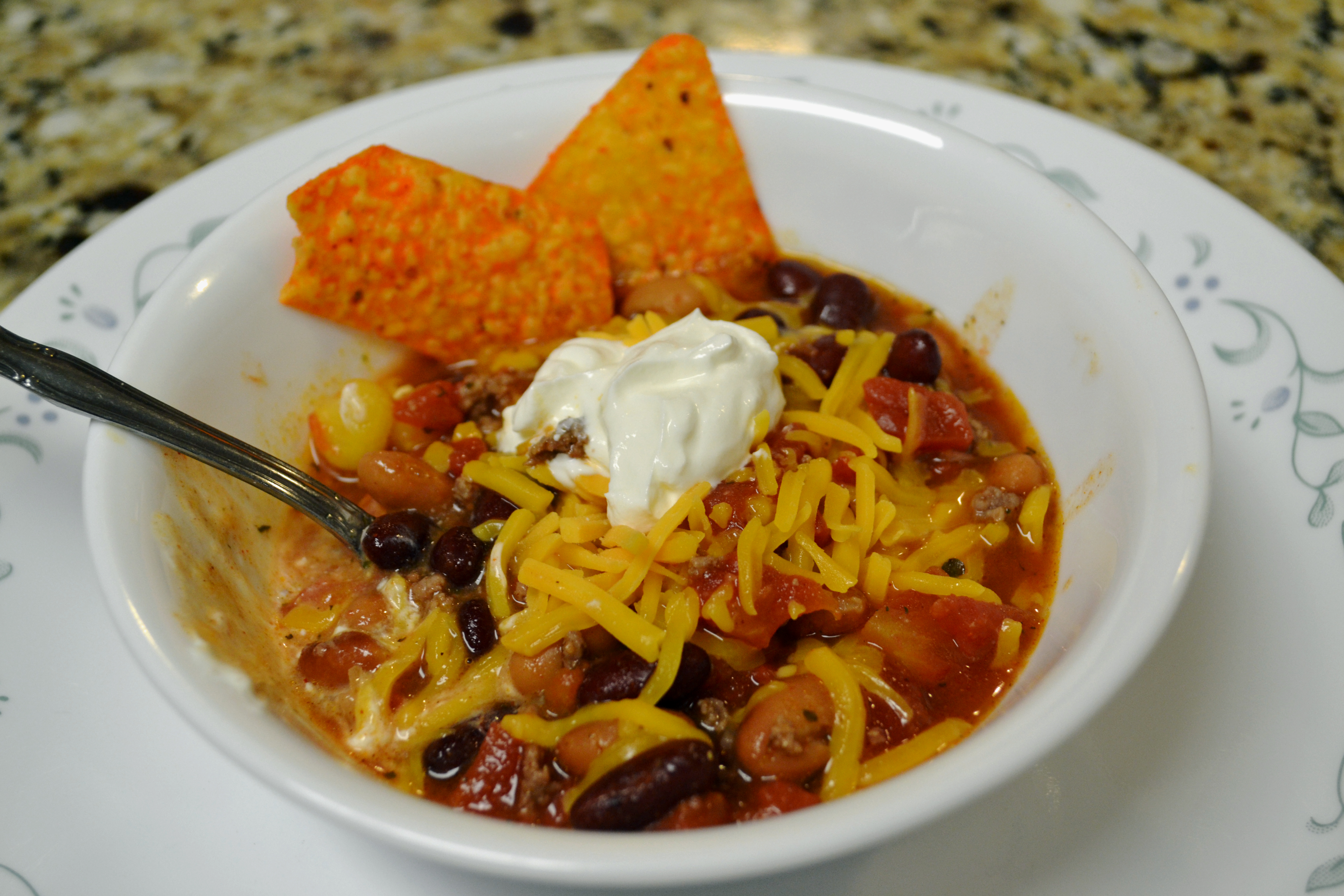 Garnish: shredded cheese, sour cream, nacho cheese Doritos
