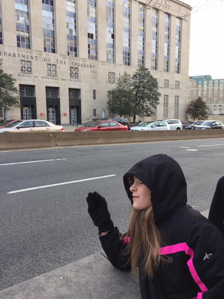 Our tour was the first one of the day. We arrived in plenty of time, too much time, actually. It was freezing cold. We parked near the Jefferson Memorial because it was free (and empty), but that meant we had a 1.5-mile trek to the Bureau of Engraving and Printing. After waiting for 40 minutes in the wind, we were ready to hug the neck of the man who opened the door for us. The warm air was so inviting, that I didn’t even mind being searched…until they said, “Wait a minute, we’re not ready yet, go back outside.” The sheer heartbreak of it all! I hate to even recall it!
