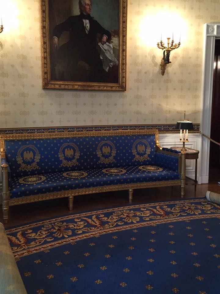 The Blue Room was re-furnished by James Monroe after the British burned it. This is where President Grover Cleveland married Frances Folsom. The couch in this room is curved exactly to fit the oval shape of this room.
